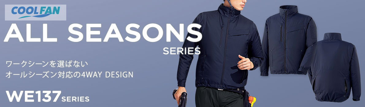 ミドリ安全の「COOLFAN(クールファン)」は、空調の無い場所に最適な作業服です。「COOLFAN」は、ユニフォームの背面腰部に装着されたファンにより外気を吸い込んで、衣服内に通過させることで汗を蒸発させ、その気化熱で涼しく感じることのできる電動ファン付き作業服です。オールシーズンシリーズは、4つの着用方法で幅広いワークシーンにマッチする、オールシーズン対応の4WAYブルゾンです。