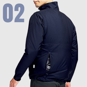 ファンを収納。ファスナーでファン取り付け部を閉じ、軽量ウインドブレーカーとして着用できます。