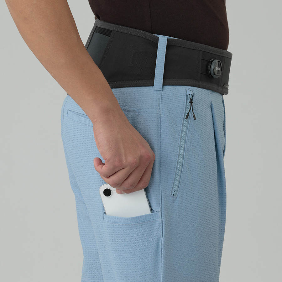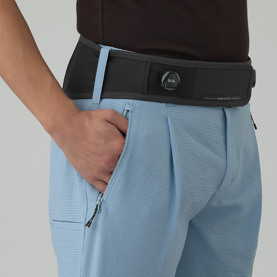| 特徴 | 【機能】 ●2ウェイストレッチ ●吸水速乾 【商品説明】 軽量でタテヨコに伸びる素材を使用。 吸水速乾性に優れ、凹凸のあるサッカー素材は見た目にも涼し気な印象を与えてくれます。タックが入ることにより腰回りに適度な空間が生まれ空気が通リやすくなり快適な状態を作り出します。BOA(R)システム搭載のベルトは、場面や体調に合わせて締める緩めるが容易で、腹圧を高め腰への負担を軽減します。ベルトは取り外し可能で普通のベルトを通すことも可能です。 【原産国】 VIETNAM |