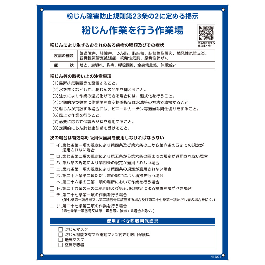 | 特徴 | ●表印刷 ●3mm径穴×4 ●労働安全衛生規則等の一部を改正する省令に基づいた標識です。 ●PETボトルリサイクルボードを使用しており環境に配慮した標識です。 ●便利なチェックマークステッカー(10片)が付属しています。 ●表示内容:粉じん障害防止規則第23条の2に定める掲示 ●取付仕様:ビスまたはテープ止め(ビス、テープ別売) |